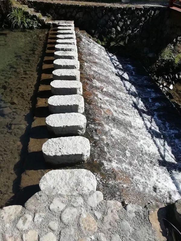 停车厂之下有条石板路往下,我拾街而下,平台内侧停了很多自行车供游人挑选。左侧是条小溪流,溪水很清,清澈见底,像孩童的眼睛清的澄澈。站在溪边,走过溪流之上均匀一致的石块。溪水从这里冲流而下,溅起点点白色的浪花。我小心翼翼的在石块上行走。阳光下,我的影子与我随行。