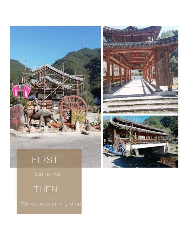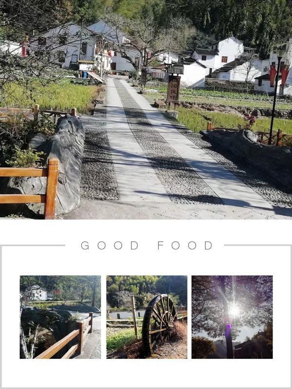 往前便是一处芭蕉林,在这个冬日里芭蕉依旧翠绿如初,好似寒冷的冬日对它没有半分影响。感觉走了很长的一段路,才看到入村的石碑,我离我心目中的桃源又靠近了一步。入了村后,整个视线便开阔起来,在我面前是一个很大的停车厂,停车厂中间是个农耕的场景。屋舍,良田,耕牛,等等形象生动的描绘出了农耕的场景,也体现出了伏叶村淳朴的生活。