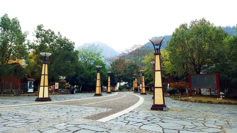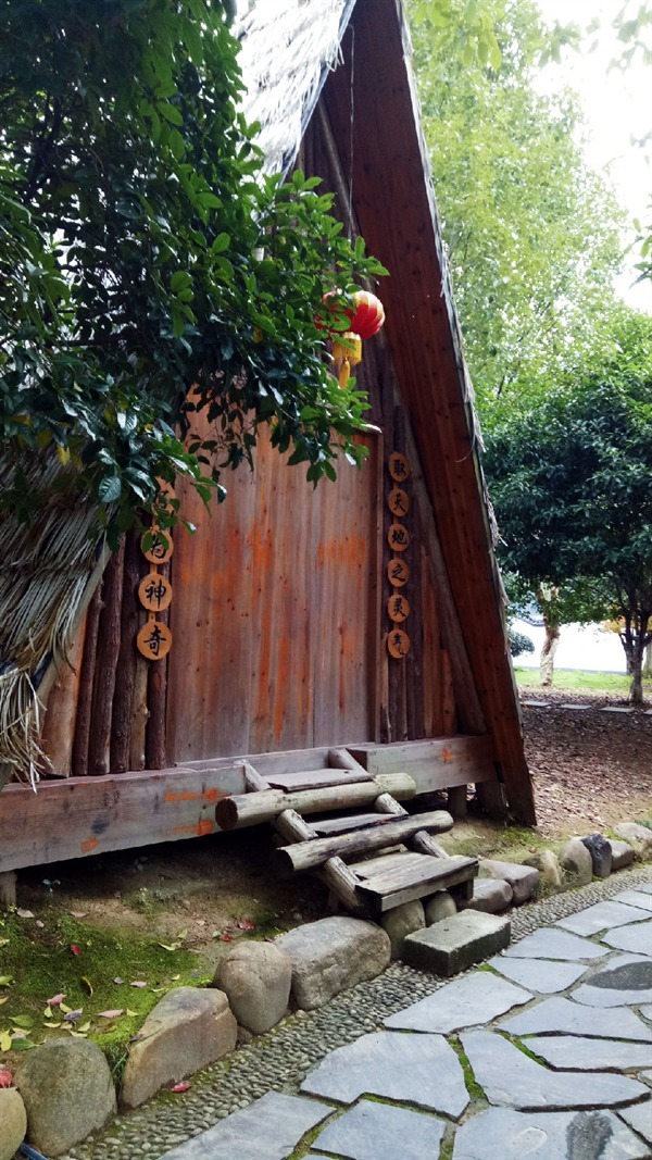 广场边的林子下,是一座一座仿造的畲族小木屋,有的挂牌叫畲药铺,有的又是畲秀点等等。它们在林子的遮掩下显得很是神秘,只是今天都没有开门营业。小木屋很是有味道,就像是动画故事里搬出来的那样,三角型的样子,外面铺着厚厚的茅草,门前的小梯子也是由原木拼接而成的,门上还挂着大红灯笼,也许是快过年了吧,透露着一股节日的氛围。对这小木屋简直喜欢的不得了,差点晚上就打算住在这里了。