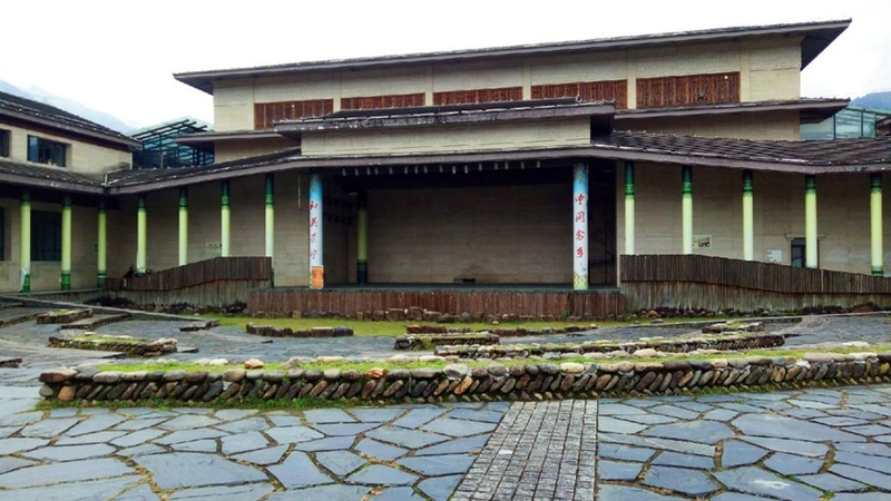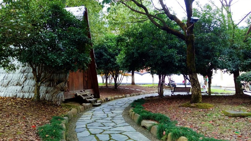 林子的另一边是一座露天的戏台,颜色也是棕色、深棕色、浅棕色的组合,台下的座位也都是圆滑的石块堆砌起来的,呈半圆形围绕着戏台,这就有点像罗马竞技场的感觉了。不过座位的长短分布倒像是中国古代传统的八卦的样子。石块边缘还布满青苔,想着在这儿听一场畲族山歌表演也是极好的感受吧!