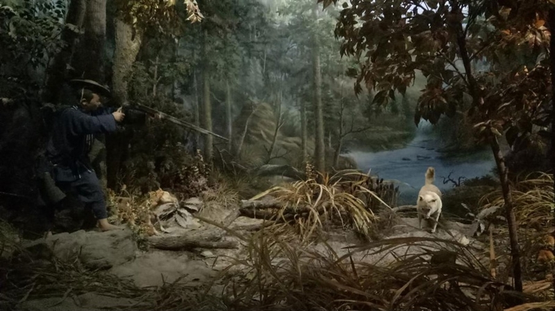 首先就是起源了,畲族自称为山哈,就是山里客人的意思。因此畲族的祖先就是生活在大山里的,所以他们大部分靠狩猎为生。博物馆里就用情景再现的方式,展现了畲族在山林里用猎枪狩猎的场景。