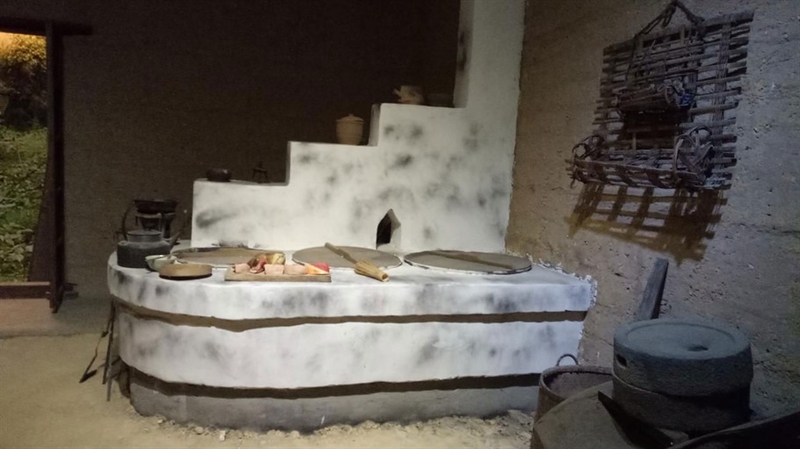 还有就是畲族人民的厨房,以前的厨房没有煤气没有点,他们就用砖块和泥土砌起这样的灶台,然后放上几口大小不一的锅,这样不单单可以满足自家人平时烧火做饭的需求,还可以满足大摆宴席时的需求了。灶台上还放着盐罐子,油罐子,酱油罐子就像外婆家的厨房,透露着生活的气息,好像已经能看见屋顶上升起做饭的炊烟袅袅了呢。灶台边还有农家的石墨,以前的人用它最多的就是磨黄豆做豆腐了。