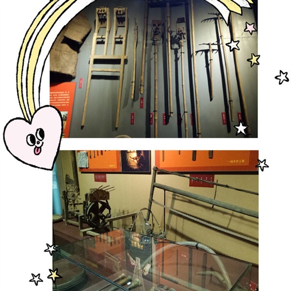 接着就是农具的成列处了,各种农具,更多的是木质的,这也说明以前人民的生产率是较低的,我唯一认识的就是用来扒土的猪八戒的那个九齿钉耙,真的是从小西游记中毒的孩子了。