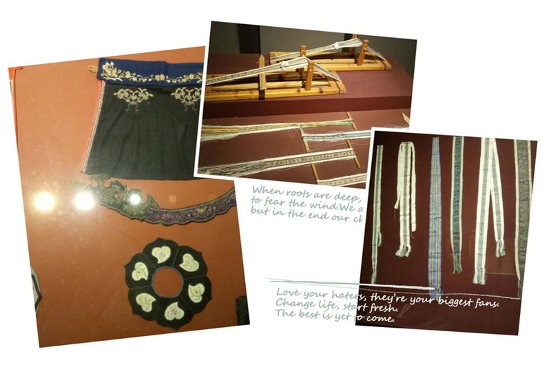 然后介绍的是畲族姑娘织的花带和秀的绣品。畲族作为少 数民族,有着其特色的服饰,最特别的就是这花带,听说以前畲族男女定情就是靠着花带的。花带更传递着畲族的神秘文字,它是从古代一直传递至今的一种古老语言。