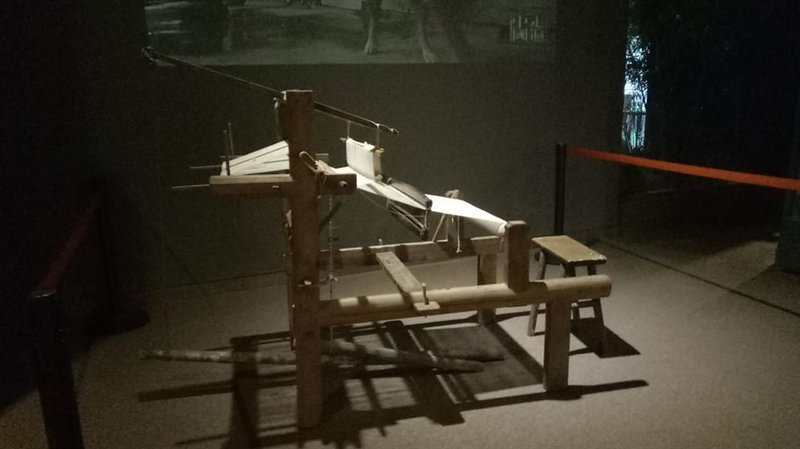 除了织花带的那种手拿的小的织布机,博物馆里还藏着这种简单的较大型的织布机,当然这织布机不能跟南京云锦那样一台织布机就一个房间的那种织布机比了,这毕竟是农家自用的织布机嘛。后面大屏幕还不停播放着畲族的山歌视频,仿佛在这黑暗的灯光下就出现了一位一边唱山歌一边织着布的母亲,她一手拿着木梭,穿梭在根根丝线之间,也将自己的爱一点一点织进着布里。