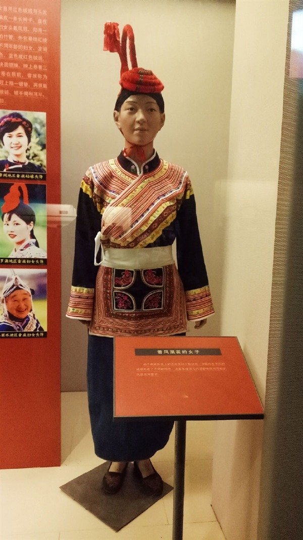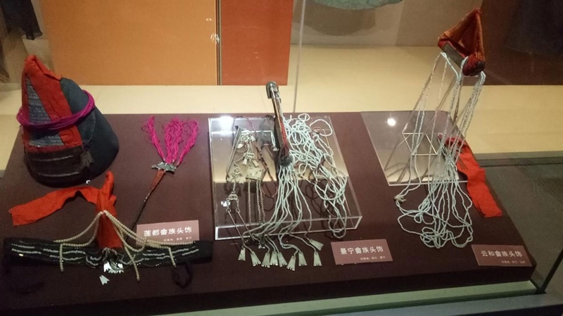 然后给我门展现的就是畲族衣服的成品了,畲族人民自称为凤凰的后代,因此他们的服装被称为凤凰服,她们盘在头上的造型被称为凤凰头。这凤凰头很是特别,不像湘西苗族那样的用全部的白银堆砌而成的头冠,而是直接用红色的布盘在头上,在脑后留着一条弯曲翘起的小尾巴。