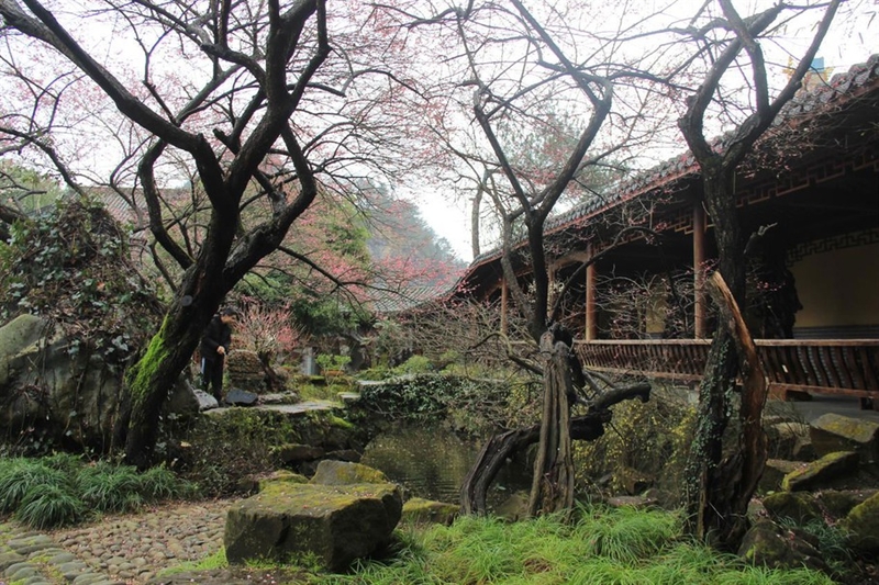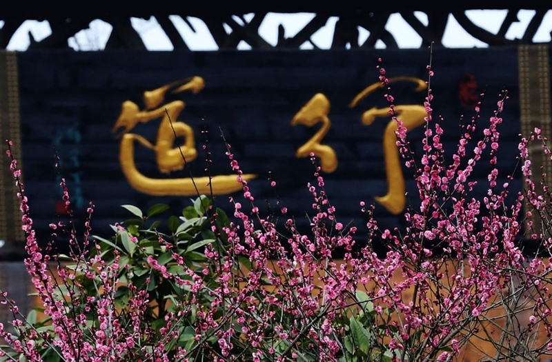 ​当然这里梅花众多,有的倚着古朴的仿古建筑生长着,从树下走过抬头看,便整个天空都是粉色的梅花了。心想,此时要是一阵风起,便漫天都是粉色的花瓣飞舞;要是一阵雨落,便铺天盖地都是梅花雨。