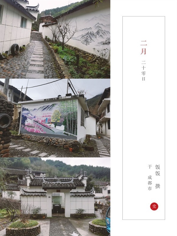 道路两旁的梅花,花无叶,却满含花苞,仿佛在等待着某个时机,竞相开放。虽是未看到花开满枝的梅花,却也被家家户户墙上的壁画所吸引了目光。村子里依然是冬天那般寂寞如雪的模样,墙上的“梅花”却开的正是灿烂。远处青色的远山,漆黑的柏油马路,路边花开满枝的红梅,远处的蓝天,还有马路上行走闲逛的行人。每一幅画作在画师的笔下变得栩栩如生,如此动人和贴近生活,把梅花于人生活的点点滴滴用一笔一画都刻画在了墙上。这个画师出神入化的画工让我叹服,或许是一种怡然自得的情怀,以及对乡村生活的过多参透,才能在它的花里看到那么多对生活的感悟。