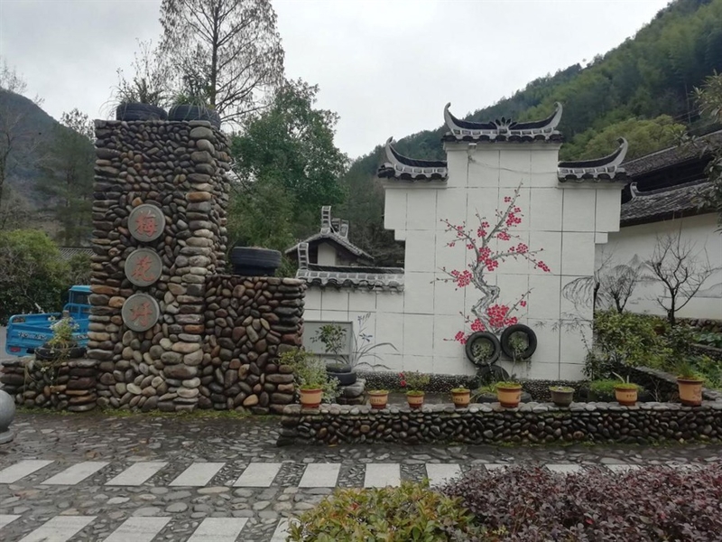 梅花于绝对是个充满文艺气息的小村庄,它很小,却也很精致。墙上的壁画到处可见,你仔细观察也许会发现房子最顶端靠近屋檐处都有梅花枝图案,这像极了古代少女额间用朱砂点的印花。白色的墙面,轻启的檐角,青灰色的叠瓦,黑色线条与白色线条交织在一起,透着几分文艺与古朴的气息。