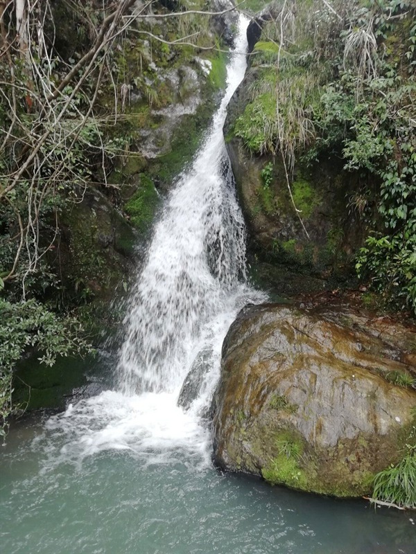 慢慢前行,沿着相反的方向,走过来时的路,李宝村一点一点的逐渐消失在我的视线中,如同落日的余晖,慢慢的沉入海面一般。在回过头,已不见踪迹。沿着上行的山道下行,下行的路快了好多,行走的速度,像风行走了八万里。一路上溪流作伴。每一道都是美丽的风景。有些藏在茂林修竹之中,像被偶然挖掘到的宝藏闪闪发光。水流从山涧之中汇聚在一起形成一条白色的水龙吞云吐雾般飞驰而下注入底下的深潭。潭中的水很清,泛着淡淡的青绿。