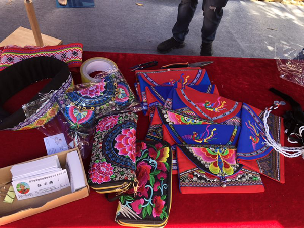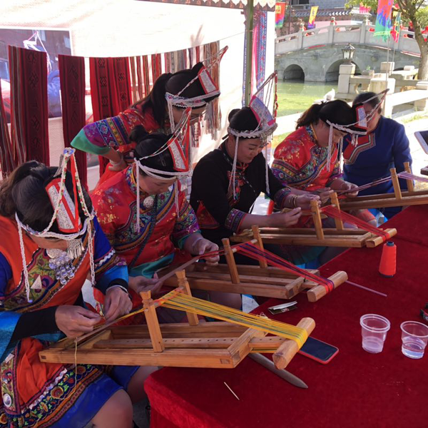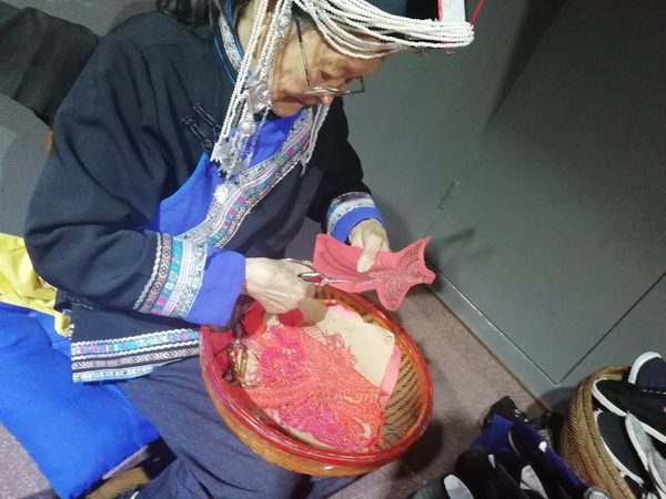 展厅的一个角落里,有两位老婆婆坐在那里,一个老婆婆在那里织着畲族彩带,黑白相间的带子就像两条交织的经纬线,通过线条的穿梭融合在一起。另外一个啊婆在那里艺术剪纸。小小的红色纸张在她的巧手之下不一会儿就变成了一只火红的凤凰,巧妙绝伦。