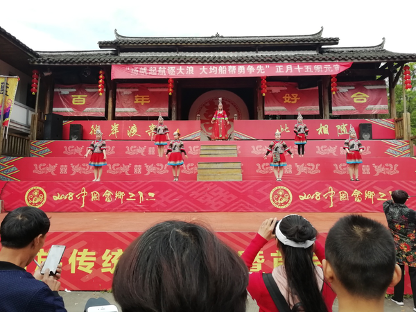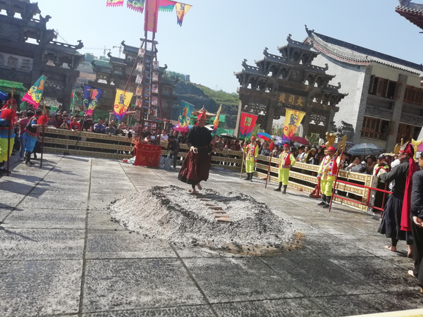 在两座高塔之前,哪里建了一座围场,沿着围场一圈间隔插着雷蓝钟盘四大姓氏的彩旗。围场一圈密密麻麻的围了一圈人。我跟小伙伴拨开拥挤的人群才勉强挤到前面观望,这里正在进行的是一场烈火绝技的表演。靠近围场,感觉到了前所未有的炎热。三十度的太阳炙烤着大地。围场之中用炭火搞了个火堆,青色文化砖铺在地面上,使得围场周围的温度越发的炎热。等了好一会,表演人员才开始表演,他的手里拿着骨器来来回回的跳着,像极了古时候萨满法师驱邪避魔做的法事。有一种巫师的感觉,片刻之后,他从炭火之上翻滚过去,身上布满了灰尘。有些大胆的游客脱了鞋子从炭火之中走过,看的我心惊肉跳。我想但凡有点猎奇心理,又胆大无畏的游客都不会放过这样绝佳的机会寻求刺激。