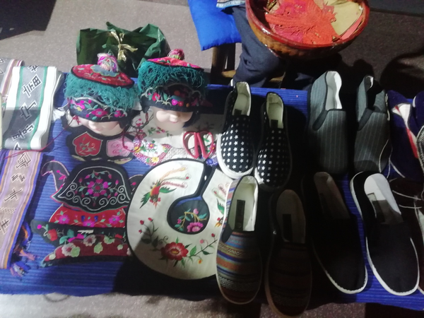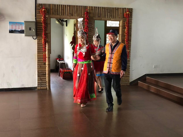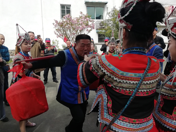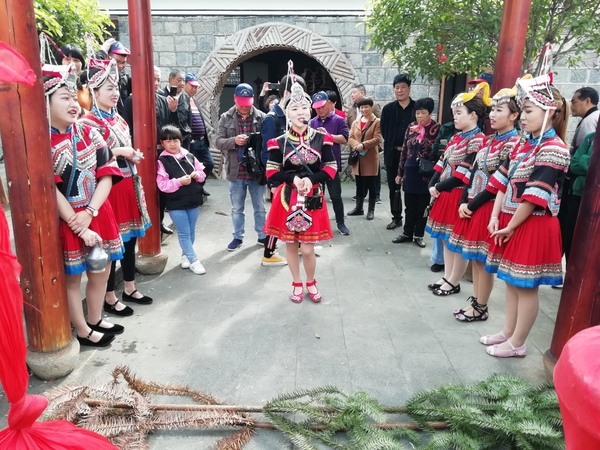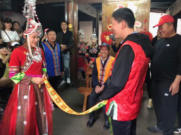 两人一人执着丝带的一头进行了个拜天地的仪式。礼成,新娘给新郎戴上自己亲手制作的布包,新郎从包里抓出一大把的糖果洒向人群,跟人们分享着此刻的喜悦。底下的游客也很热情,疯抢一番,也是来沾沾喜气的。到这里,表演算是告一段路了。