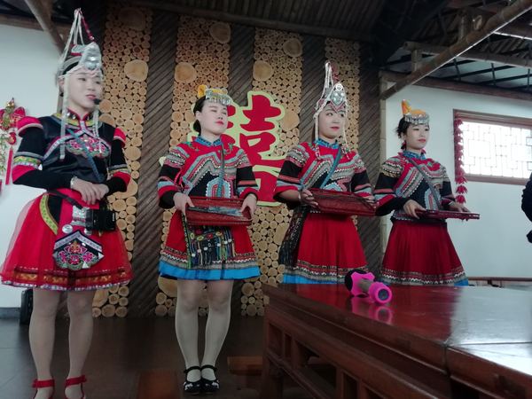 调皮的畲家姑娘一直把伴郎的担子往后拽,伴郎使出九牛二虎之力跟他们对抗像拔河一样,最终伴郎还是喝到了主持人手中的酒,摇晃过程中酒也洒了一地。这个环节过了便进入了内堂,堂内设置了很多座位供游客坐,我找了个比较前面的座位坐下来,好客的畲家姑娘端上 了自家的茶水款待来自远方的客人。喝一口,茶香醇厚,甚是香甜,一如畲族人民的热情般温热的茶水。