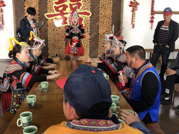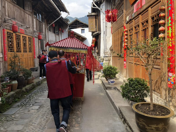 红色花轿的帷幔在风中飘荡,新娘坐在轿子里,前后由两个轿夫抬着,身后锣鼓喧天,整个世界都热闹了,这像极了古时候的婚礼。到了一处屋舍,新娘下轿,同新郎两人在门口迎客,等到宾客到齐了,新娘入内给我们表演畲族的洗茶礼,然后在给伴郎,新郎等斟上一杯。