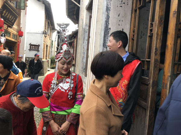 挑好伴郎,新郎,大舅子这些人选后,我们便在台下静静的欣赏着舞台之上畲家姑娘的舞蹈,看完表演,我们跟着主持人往小巷子里走。