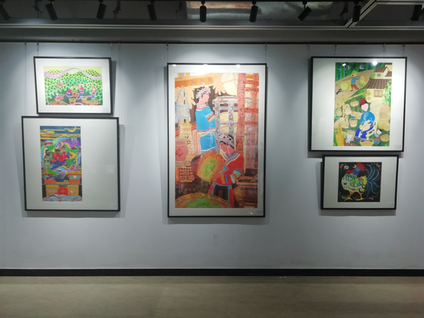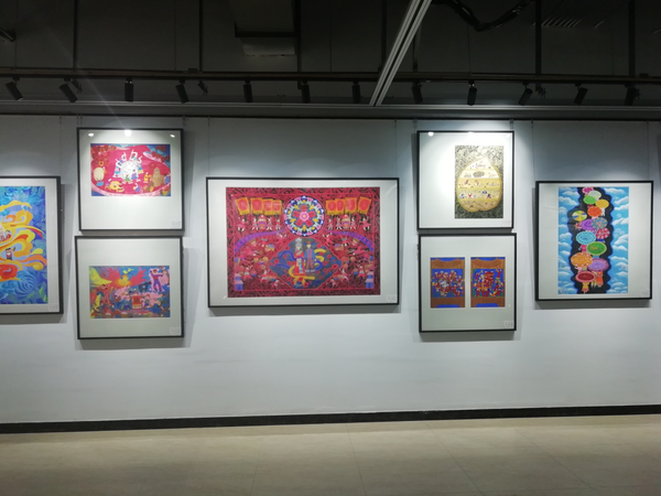 从博物馆中出来,便去了对面的城市展览馆。往常展览馆是不对外开放的。三月初三这天,敕木山中国好畲画画展放在这里展出。沿着指示标识往前走,进了展厅。展厅的墙面上挂满了各式各样的畲画作品。畲画作品的基本色调都比较浓重艳丽,整个构图非常的饱满,想象力很丰富,就像孩子笔下的世界一样唯美浪漫。表现手法比较独到,涉及的范围也比较广,有畲家的田园风光,畲族人民,畲族图腾等,用优美的绘画语言和艺术魅力向游客们展现浓郁的畲家风情。
