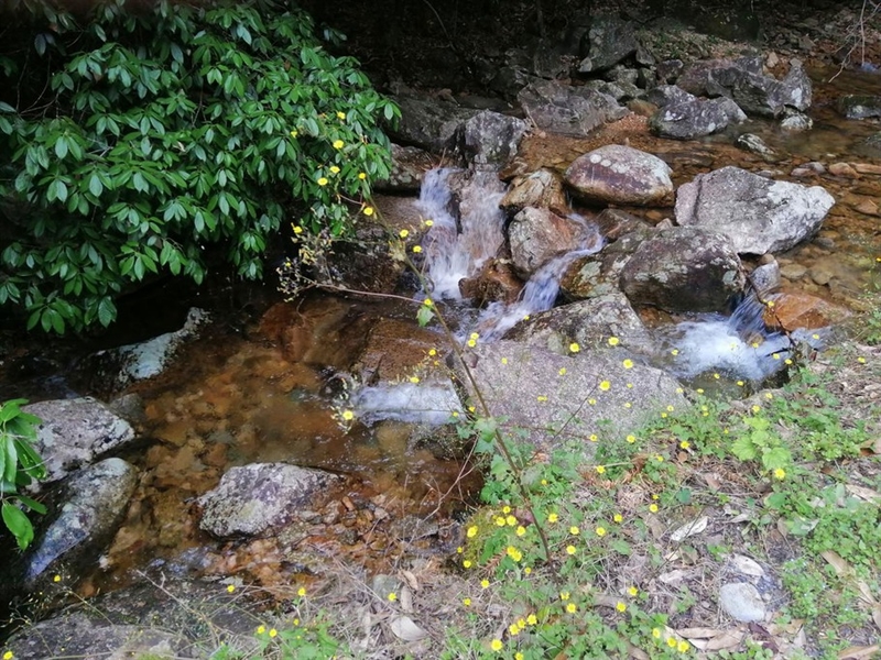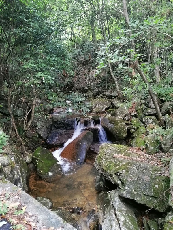 一路上潺潺的溪水哗哗的从山顶一路流淌下来,经过弯弯曲曲的老枝干,经过因为长了青苔而滑溜溜的岩壁,最后汇聚在小水潭里。这里的溪水清澈见底,听说,这水是可以直接饮用呢。