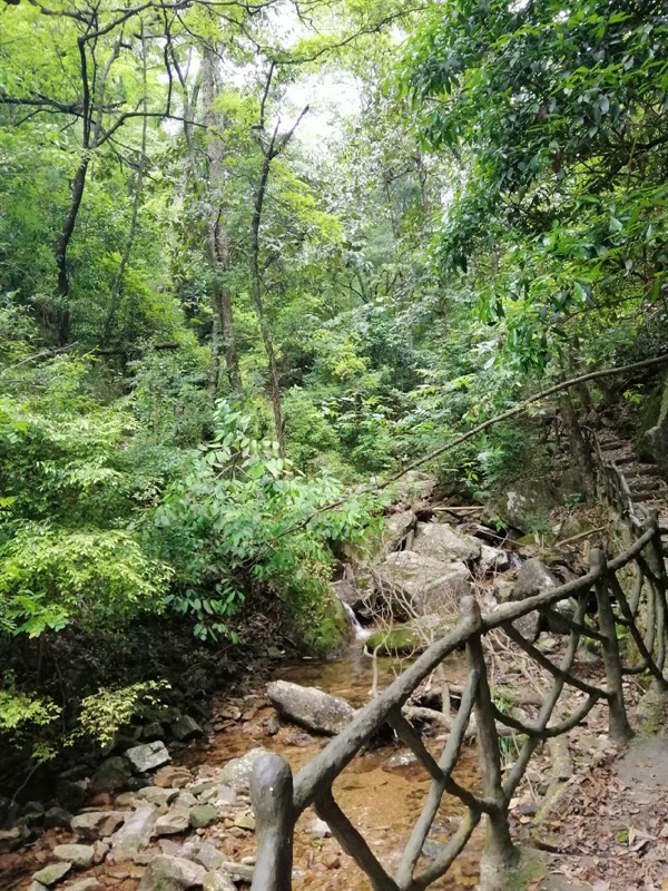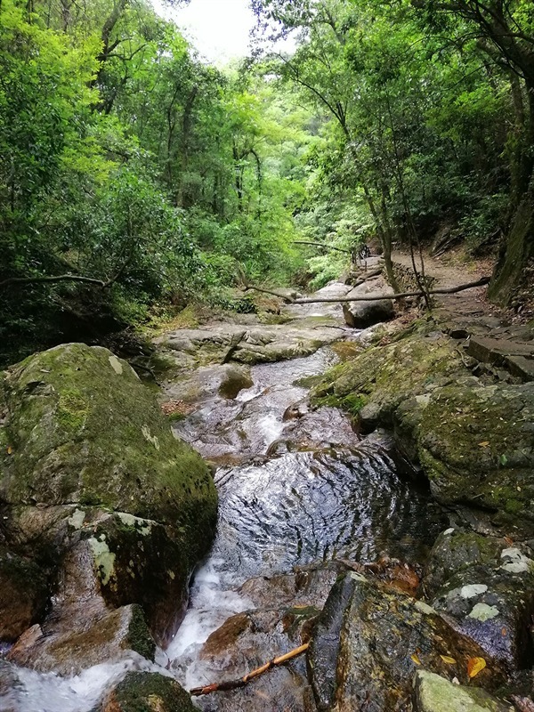 今日不巧通往山脚的一处路段正在施工,景区内的游览车无法通行,我们只能步行前往山脚。从售票处进入景区,我们花了30分钟走到山脚。虽然还未真的进入古田山,但一路走上来我们也有别样的收获。上山的路并没有什么陡峭的地方,享受着徐徐微风,路边的小溪流静静的,也是一副小家碧玉的模样。