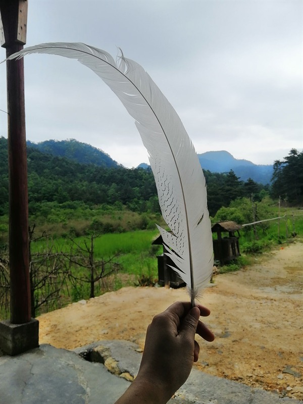 同行的朋友在道路旁发现了某种动物掉落的羽毛,长长的羽翎,可以想象这是多么巨大的鸟类。朋友看我甚是喜欢,便将其送予我当作此行的纪念物。