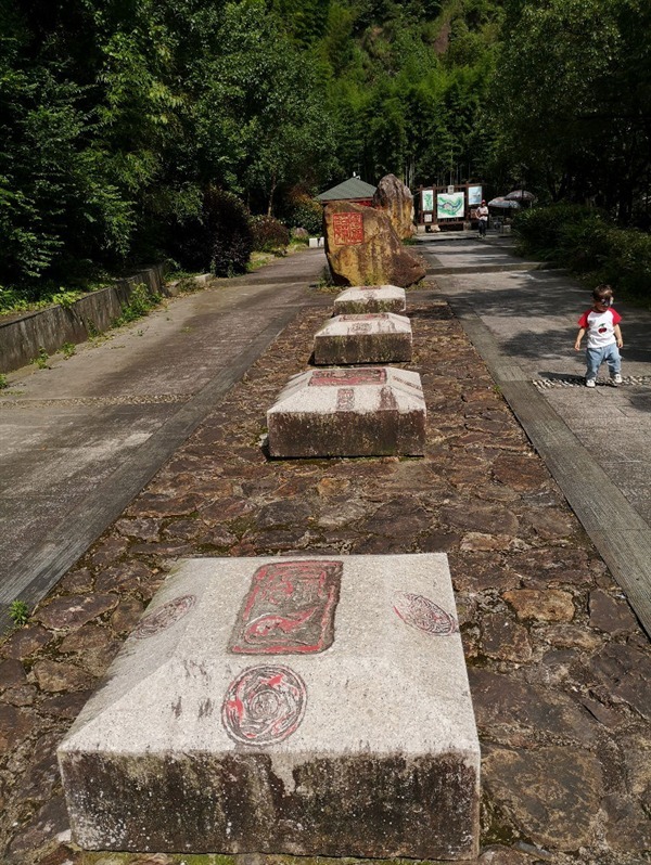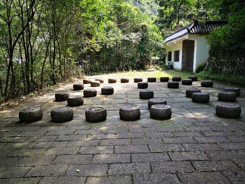 绕过“养生池”,步入山道,指示牌显示前方有一处“千丝岩瀑布”,时近正午,太阳高悬,天气越来越热,此时去瀑布下一定是非常凉爽的。半路上,见到了一处石刻棋盘,是按照中国传统的象棋摆放的,每颗棋子目测重达百斤,这样的棋子,这样的棋盘,想必也是给山里的神仙准备的,凡人是万万下不动的。
