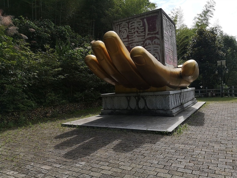 沿着蜿蜒辗转的小路闲逛完“中华印园”后,回到主路,沿阶前行,不几步就到了“佛手”景观入口处,沿小径深入,便可到达“佛手”景观台,墙上斑驳的印刻诉说着历史的沧桑,初时入园,远远看见这“佛手”并觉得大,直待走到近前,才感到震撼,成 人般粗的手指,让人不禁想起了那镇压孙悟空的如来佛祖的五指山,“佛手”掌心盘放着一枚巨大的印章,四面刻字,蔚为壮观!