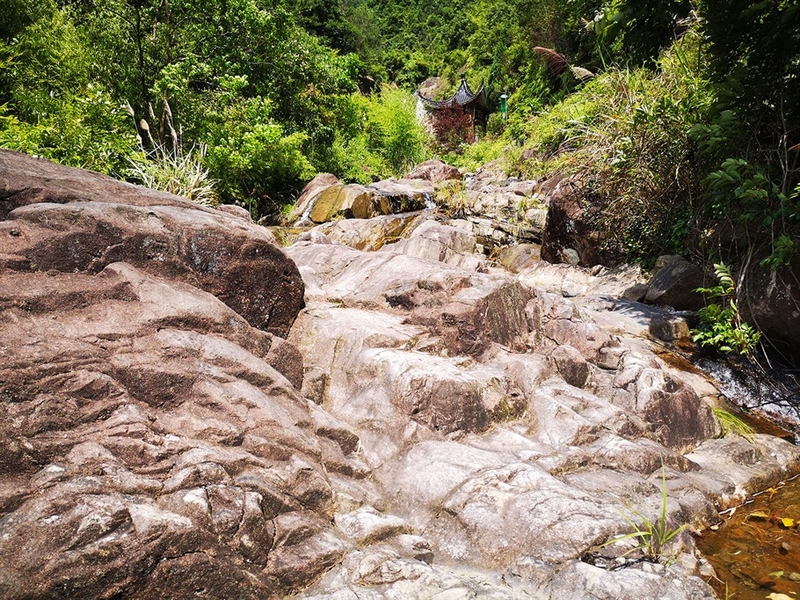 过了“石语亭”,沿溪水继续往前走,到了尽头,是一片岩壁,溪水沿着岩壁往下流,形成一道水挂,说不出的无穷妙趣。今日没下雨,水流不大,饶有兴致的沿着岩壁往上爬,想来也是有志同道合者,岩壁的边缘有浅浅的石阶凿痕,刚好够攀爬,石壁上面是一片乱石滩,常年水流的冲刷,形成了鬼斧神工的沟壑。放眼望去,水流没入那山林之中,似乎没有尽头,于是打道回府,没有继续深入。