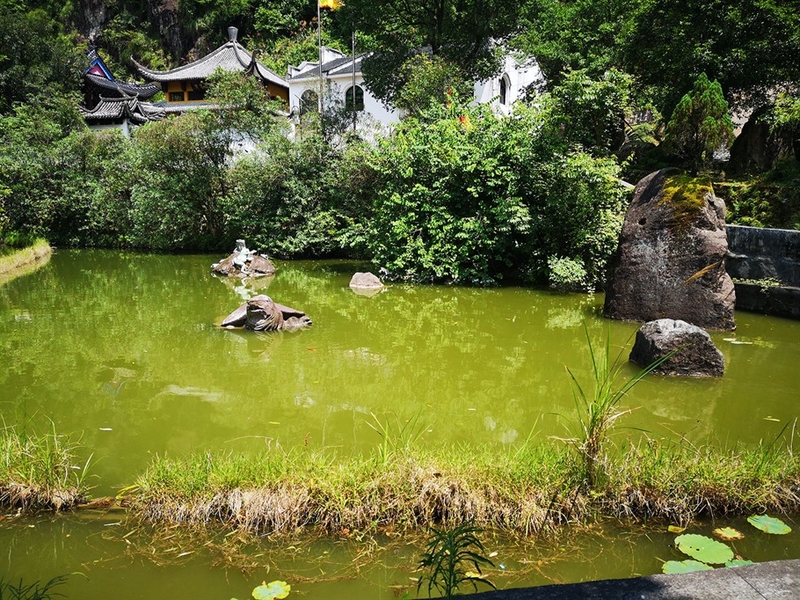 “万灵宫”下,是一处“养生池”,池中放着一只栩栩如生的大鳖,还有几只很是可爱的青蛙,池中时而有红鲤鱼窜出游荡,为这池中增添了不少生机。