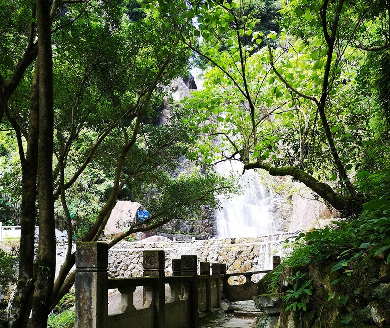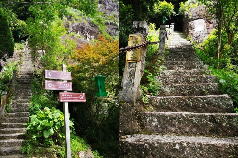 虽然很不情愿离开,但是游程还未结束,前方还有景点尚未看完。沿着瀑布旁的石阶再前进,一条在山石上凿出的道路直通山顶,叫做“天门岭”。站在山脚向上望去,陡峭异常,树影斑驳,幽深的望不到尽头,让人生不出攀登的勇气。本已是有些疲惫,所以打消了一探究竟的念头。