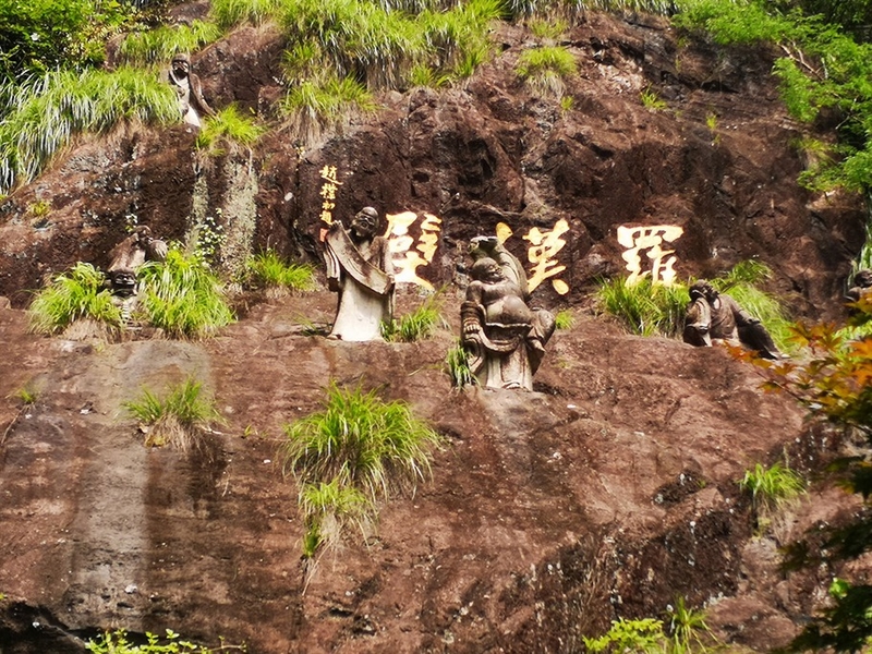 视线右移,山崖之上参差错落着几座罗汉雕像,神态各异,活灵活现,石壁上刻着“罗汉壁”几个金色大字,很是耀眼,让人不关注都不行。