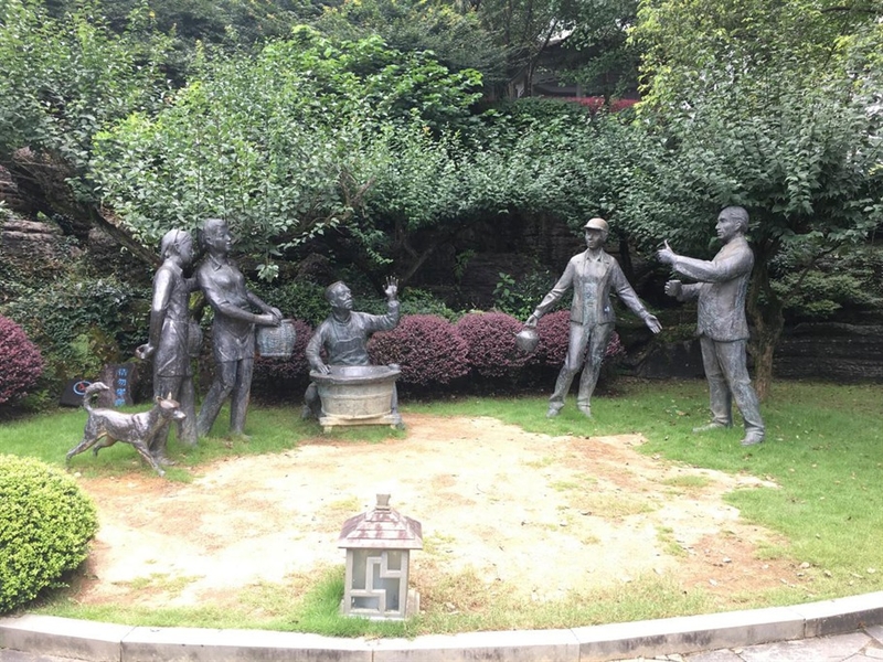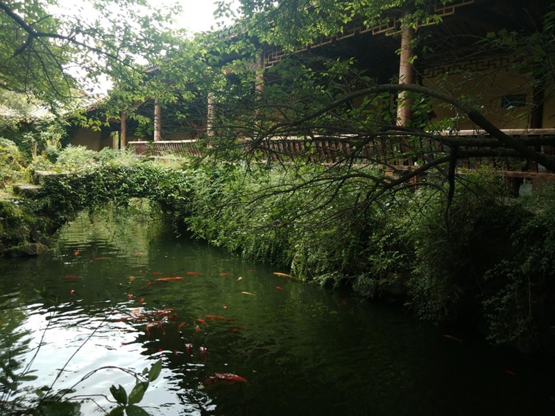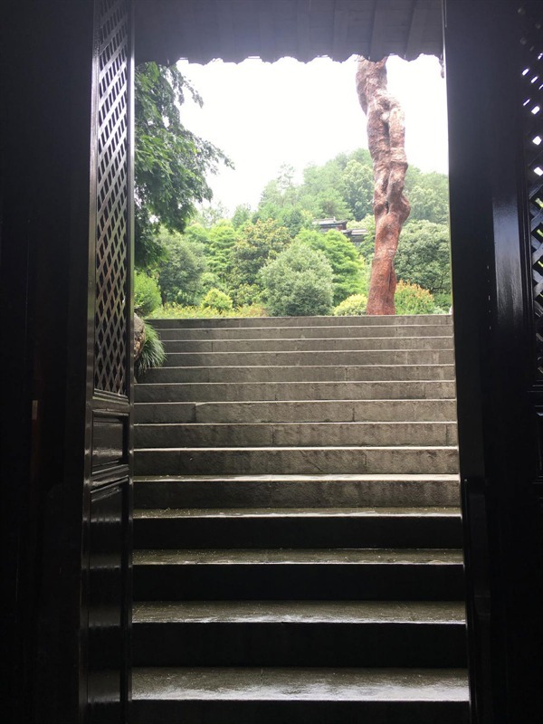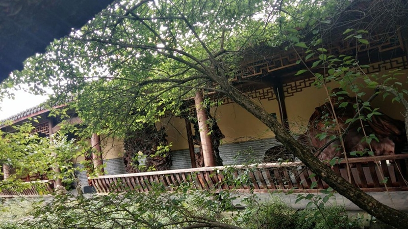 在进入之前,首先映入眼帘的就是一扇门雕塑,这幅雕塑据说是以徐大师作品是进门为原型雕刻的,而这扇门的寓意也是根据佛法,有吉祥幸福的含义。古色古香的屋檐,周围都是繁茂而高大的树木,给我有一种古色古香的感觉。