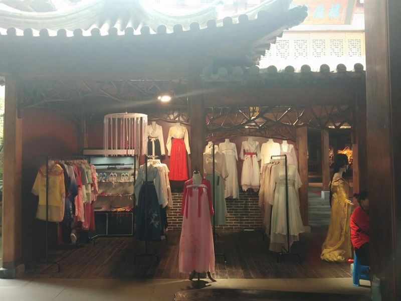 在走出这些佛文化之后,一个特殊的地方就映入了我的眼帘,那就是这个园子中有一处古装租借,田子中摆满了各种各样的服饰,有唐朝的齐胸襦裙,还有汉朝的齐腰襦裙,这不由得让我感叹道,原来古代的文化已经融丰富的融入到了我们的生活之中。