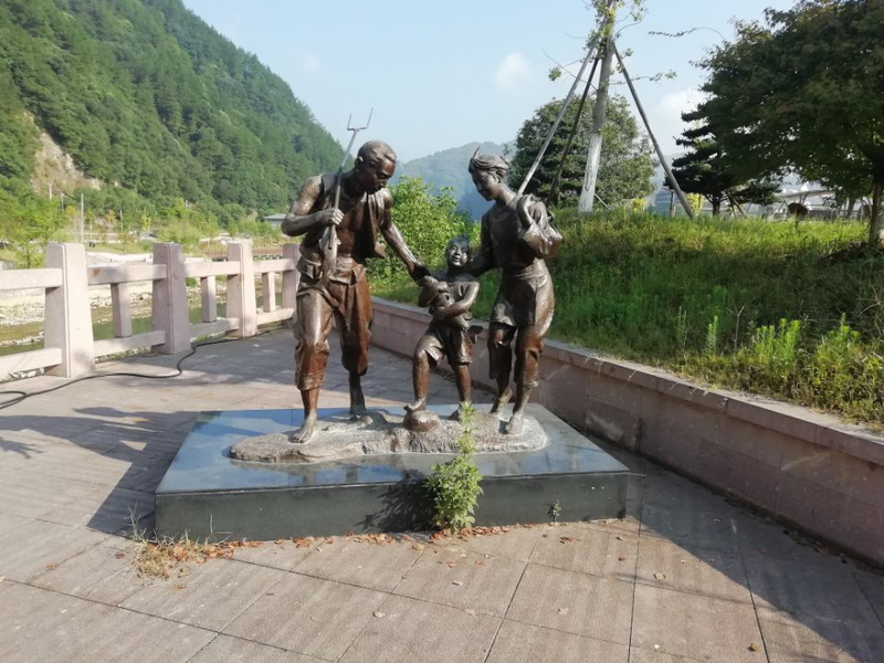 9点的清晨,带着几许凉意,我走在车站附近的绿道之上,这里是绿道的入口之处,河对岸是一座廊桥,分坐在两边。石碑之上,畲乡绿道几个鲜红的字体特别鲜明。入口之处,立着三口之家的铜像,父亲右肩扛着鱼叉,低头看着自己的孩子,母亲背着背篓,一只手搭在孩子的肩膀上,孩子怀抱大鱼,笑的一脸灿烂。多么和谐幸福的三口之家,那个时代的日子些许有些清贫却也满足和幸福,和和美美便足矣。