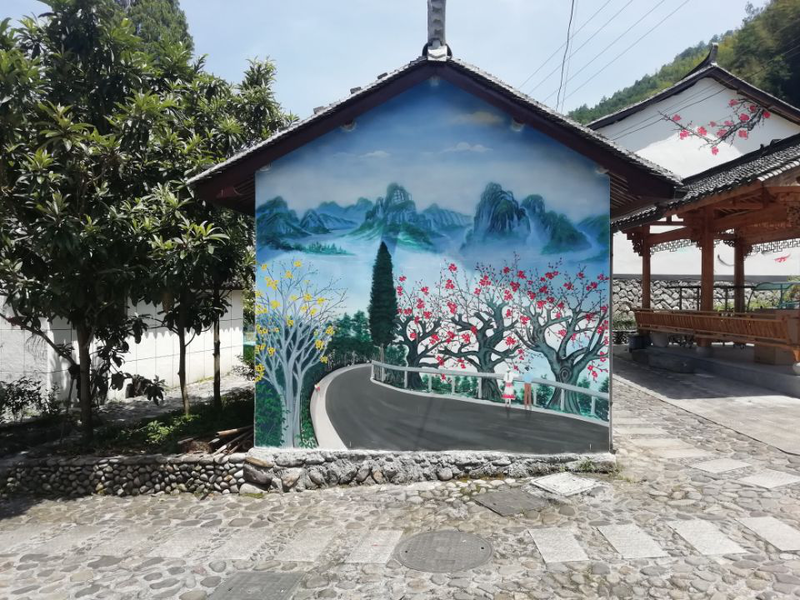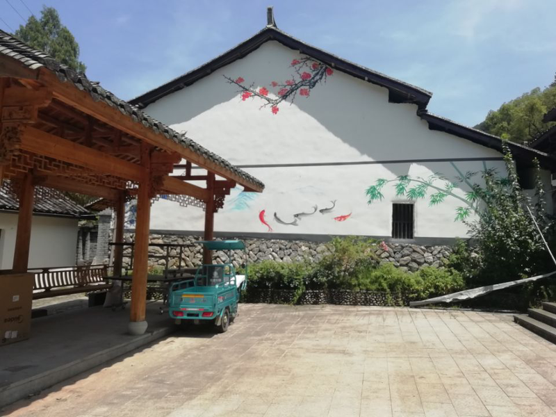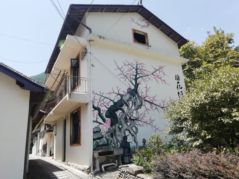 梅花于村是直属于新庄村,据有关史料记载,明朝万历年间郑姓开基时,这里梅花遍地“梅花于”由此得名,后因民国一场大洪水,村内梅树所剩无几,想着让村庄再次恢复往日繁花似锦的 日子,把这里打造成了景宁第一个赏梅点。而后,屋前屋后,种上了梅花。正月时分,梅花开的正是灿烂,炎炎夏日,它在进行着漫长的舒眠之中,蓄积勃发,等待着冬日里的一次花开漫天的盛况。虽是见不到花开满枝的场景,却也被墙上的壁画吸引了目光。