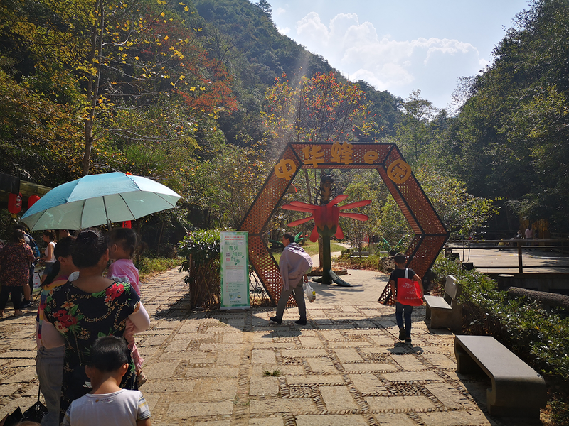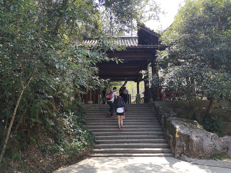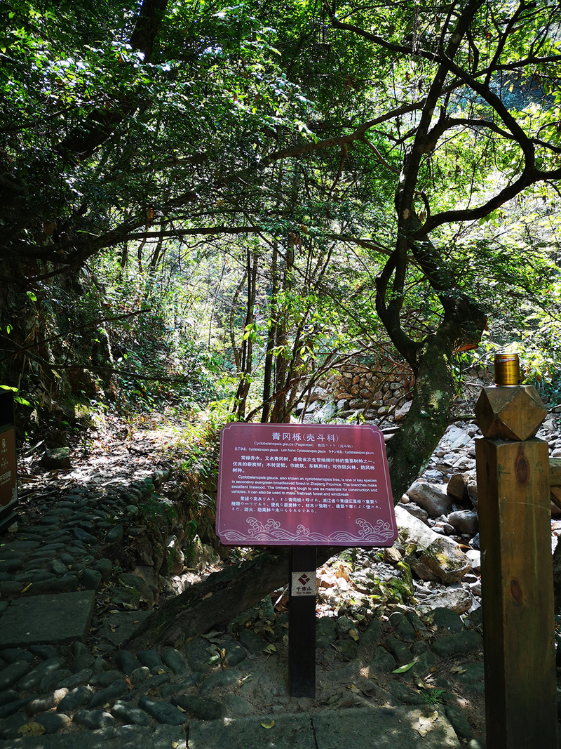 检过票,沿山道继续走,峡谷中有溪流,山道就是靠山傍水修建的,顺着山势水道蜿蜒曲折,也让游客可以一路饱览这峡谷中的山水风光。“千佛山”中的植被非常丰富,一些珍稀有名的植物都被很好的保护并且设置了标牌,让游人可以一边观光,一边增长知识。比如青冈树、板栗、乳源木莲等。据说在古时候,山中有人筑窑烧木炭,用的就是青冈树居多。