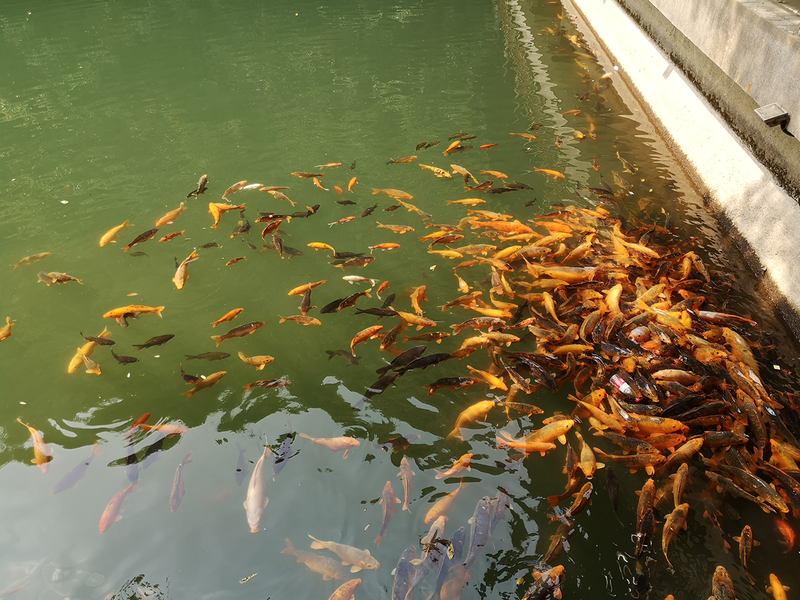 过了“喊泉”,登上一段台阶,就到了景区的检票口了,这里是一处峡谷的入口处,景区在这里修筑了水坝,水库中放养着很多锦鲤,它们似乎也是习惯了这来来往往的游客,都聚在一处等着人们喂食。