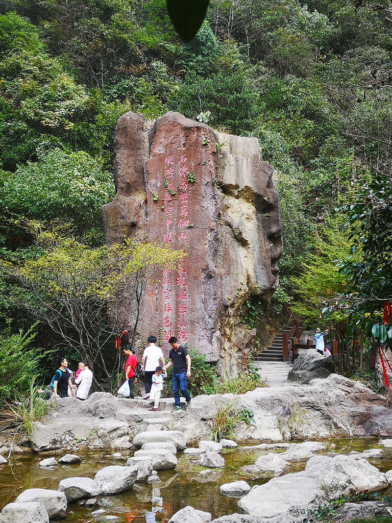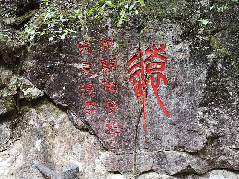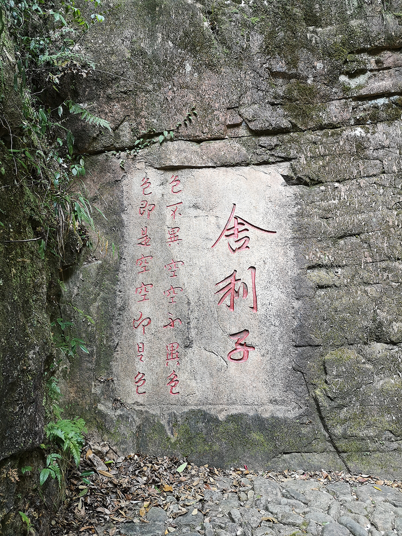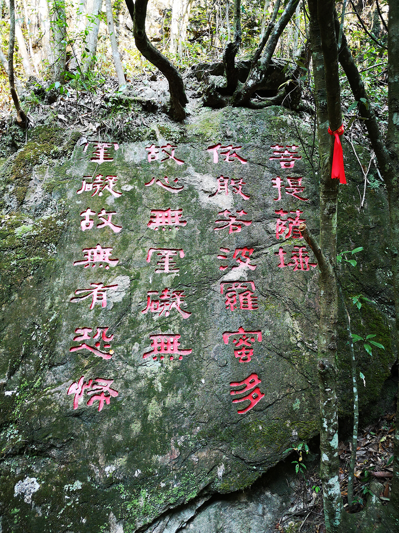 当然了,除去这峡谷中的植被、河滩、怪石、流水,自然少不了古往今来前人们探索“千佛山”时留下的石刻古迹了。因为“千佛山”这个佛教圣地的缘故,石刻大多都是关于佛教箴言的,但是寓意深远,发人深省。就比如那句我们非常熟悉的“色即是空空即是色”,也被篆刻在这斑驳的石壁上,供人阅读瞻仰。
