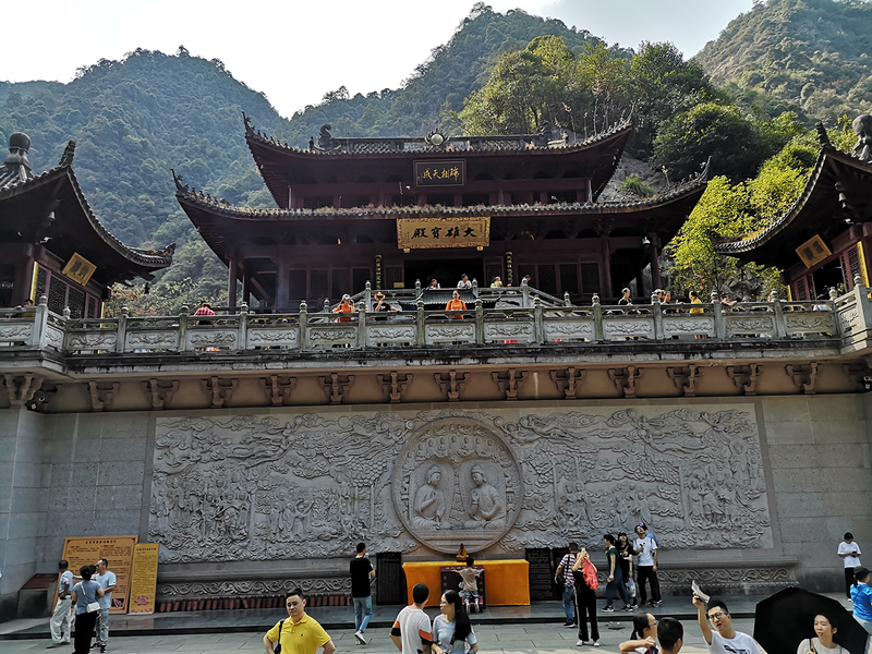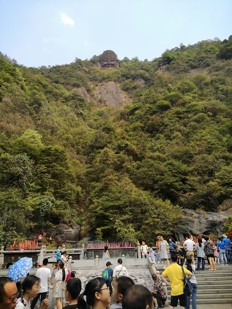不消片刻,一座宏伟的寺庙便映入眼帘,庙前人流如织,香烟袅袅,还有阵阵钟声,让人即可就有了身处佛门圣地之感。朋友让我往左看,顺着他的眼神,我扭头望去,只见前方大山上,俨然是一尊超级庞大的大佛雕像,足足占据了半个山头,蔚为壮观,让人滋滋称奇。大佛庄严肃穆,引得不少游人香客伏地跪拜。