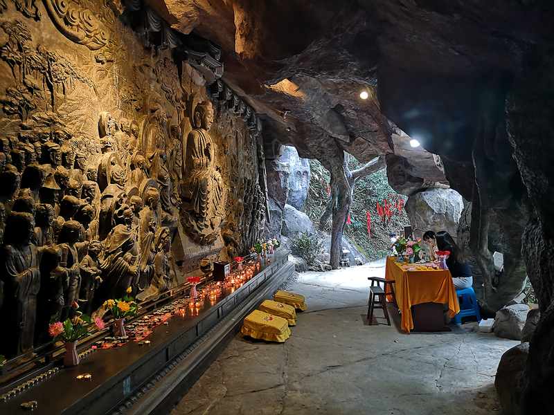 出了寺庙,沿着山脚廊檐可走到大佛脚下,不曾想这大佛脚下也是别有洞天,从外出看不出什么,里面却是一处暗洞,洞中石壁上雕刻着大大小小数不清的佛像,想必这“千佛山”之名,除了山上石头千姿百态,远看像数不清的佛像外,这洞中的千百尊佛像也是出处之一了。