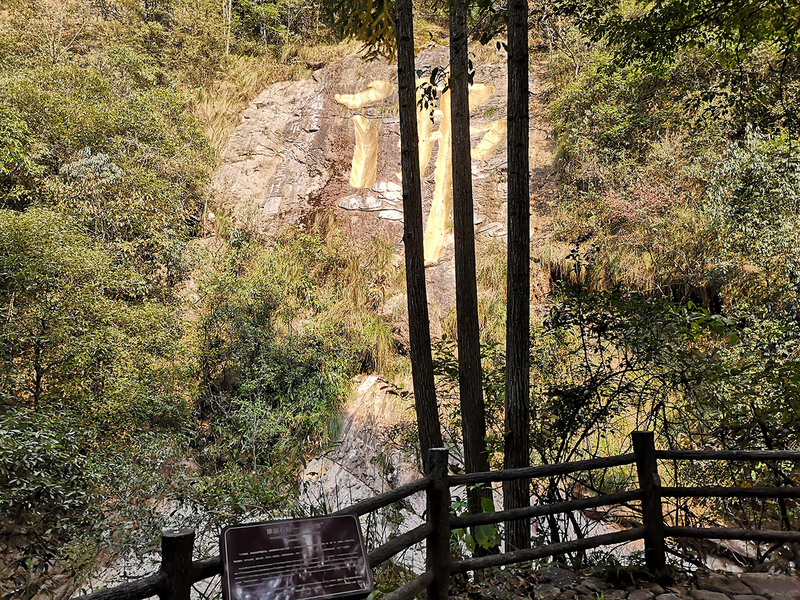 走出暗洞,出口处又到了大道上,兜兜转转一圈,也到了回程时刻了,走在下山的路上,阳光照耀在一处石壁上的“佛”字,顿时金光闪耀,神圣辉煌,让人不禁驻足观看,这也是一处有名的景点“摩崖石刻—金佛”。