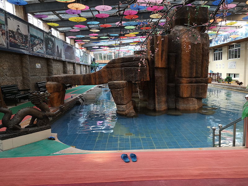 在更衣室换完衣服,走进大厅便是一处大型的室内温泉洗浴中心,在这里你可以在大池中游泳,也可在小池中浸泡,小池的种类也是各有特色,有花瓣池、牛奶池、红酒池、中药池等,可以满足各种洗浴需求。