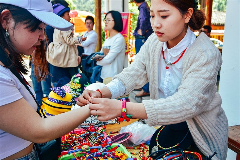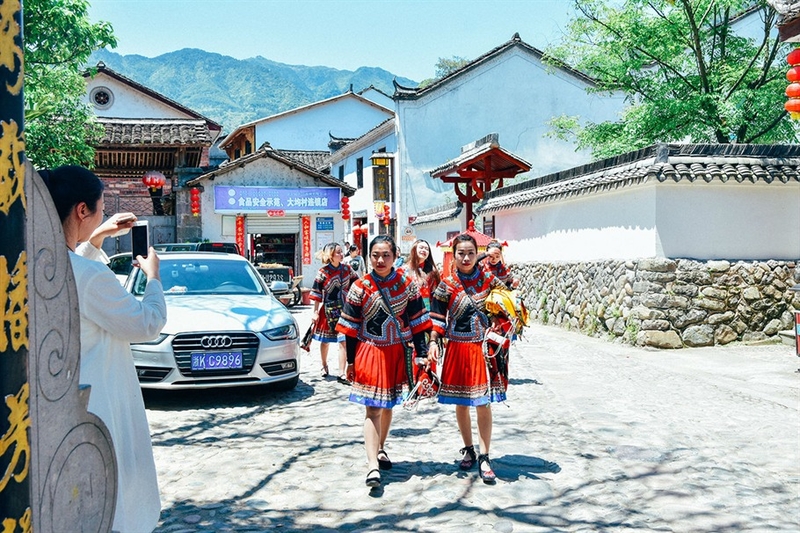 穿着民族特色服饰的少女们缓缓走来,仿佛走进了另外一个世界。