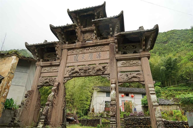 接下来就是看一看村里最具代表性的洊膺天宠石牌坊了,这个牌坊建于明隆庆三年(1569年),牌坊用花岗石以空雕、浮雕结合艺术构筑,三间、四柱、五楼,翼角起翘,脊顶双角生起,饰吻兽,歇山造。最高楼竖"荣恩"额,次两楼置云图额。明、次间上、中、下叠三枋。明间上坊作双龙抢珠浮雕,次间大额枋为主题额枋,遂昌知县池浴德题"洊膺天宠"楷书四大字。小额枋署"封工部营缮同、员外郎事主事叶弘渊,由子以藩贵立。"即因叶以蕃生前贵为朝庭郎官,其父依然享有子贵之诰封,建坊以示再次受天子宠任之意。下枋为剔空石雕双狮抢球图、瑞兽、卷云等。四柱下部均有抱鼓石前拥后扶,剔空雕刻,技艺精湛。