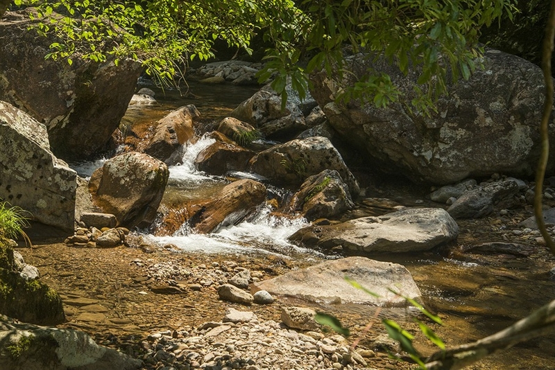 溪流奔腾而下,拍打在岩石上,在低处形成清澈见底的小水潭。一路走来,所见的都是青山绿水,不似城市间的压抑,整个人都轻松了起来。