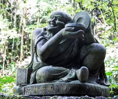 走在千佛山山水间,你能看到罗汉雕像,生态各异,栩栩如生,罗汉们或站立着思考,或静坐着枕着胳膊,世间万物,痴笑怒骂,如果想知道每个罗汉雕像的名字,石板底座就刻有。