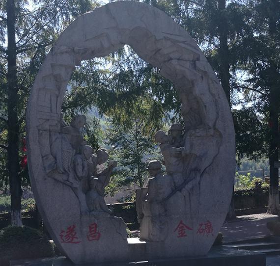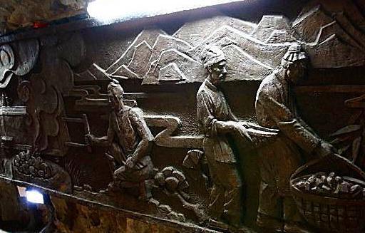 这个雕塑向我们展示了古时候人们和现在的人们开矿的场景,在古代开矿所用的工具以及保护措施,都不如现在,这里就能看出当时的开矿的工人们为了生活而不辞辛劳,不惧艰险。