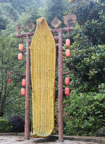这个巨大的草鞋说的是一个草鞋换粥的故事,是当年有一个精明的商人在矿洞至治炼场的小路旁,开设粥铺,从矿洞里出来的的矿工只需要把旧的草鞋给这名商人,就能换取一双新的草鞋以及一碗粥喝,在矿洞内的矿工们长时间的来回开矿,草鞋鞋底自然就嵌进去很多含金量很高的矿砂,而精明的商人就从矿工的旧草鞋上收集金银矿砂,借此发了大财。