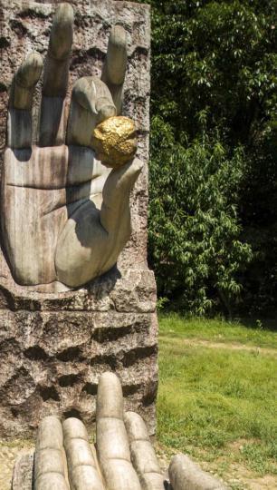 一个雕像:一手在下面呈接着的形状,一只手拿着一个类似金子的石子,就是“点石成金”了。