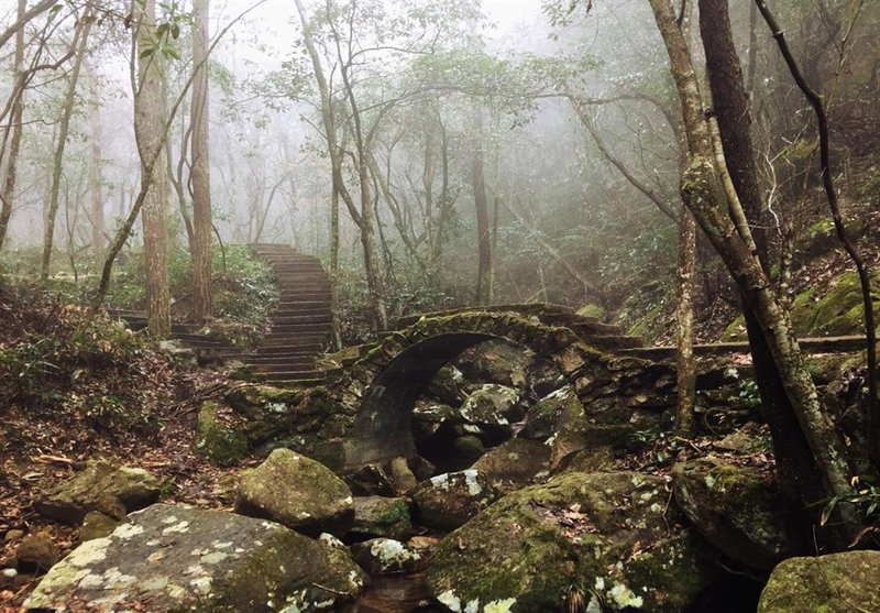 大大小小的岩石到处都是,紧密挨着,长时间的风吹雨淋,让石头表面变得及其光滑,站在上面一不小心就能滑倒,有些表面还布满了苔藓,为了让人安全的通过,就有了这座不知何时修建的小拱桥。四周弥漫着薄雾,走在台阶上,像似在仙境中一样。
