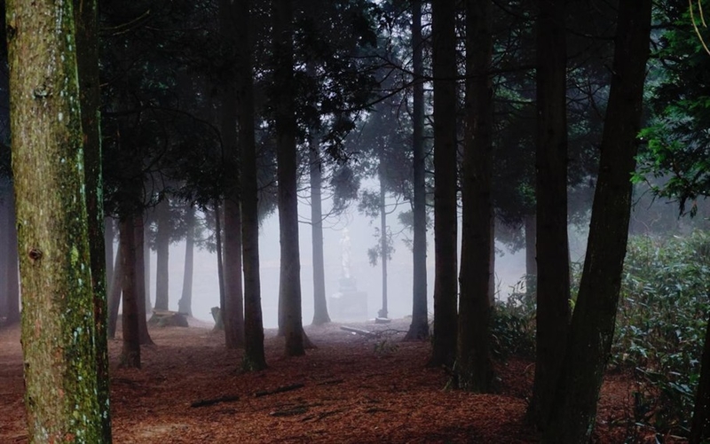 在树林间隐约能看到远处的雕像,雾气缭绕犹如仙境一般。
